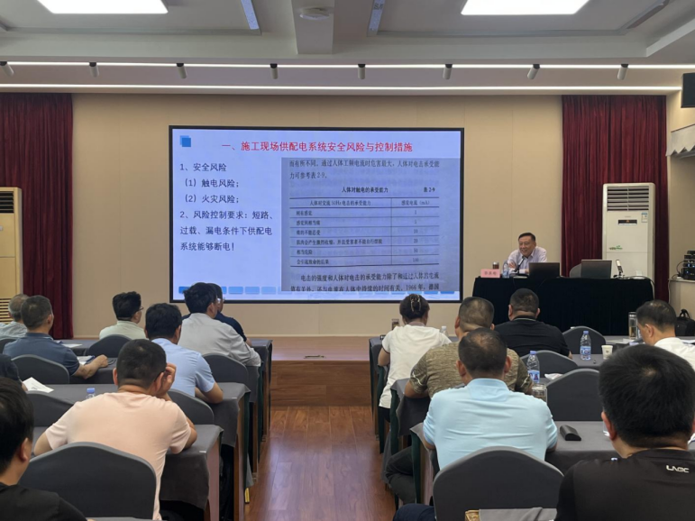 会议特邀请南京工业大学建设工程管理专业硕士生导师、南京市住建委首批危大工程专项施工方案审查论证注册专家孙其珩教授,开展《建筑与市政工程施工现场临时用电安全技术标准》培训。会上,孙其珩教授以施工现场实际情况与规范标准相结合的方式展开教学;运用多年项目一线管理经验,通过相关案例分析,加深各参会人员的印象与理解。